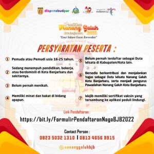 Waktu pendaftaran untuk penjaringan peserta calon NaGa Banjarbaru berlangsung mulai 1 Juli hingga 23 Juli 2022. So, Lengkapi persyaratannya dan langsung isi biodata diri melalui link yang ada di bio instagram @nananggaluhbjb Atau klik link dibawah ini :