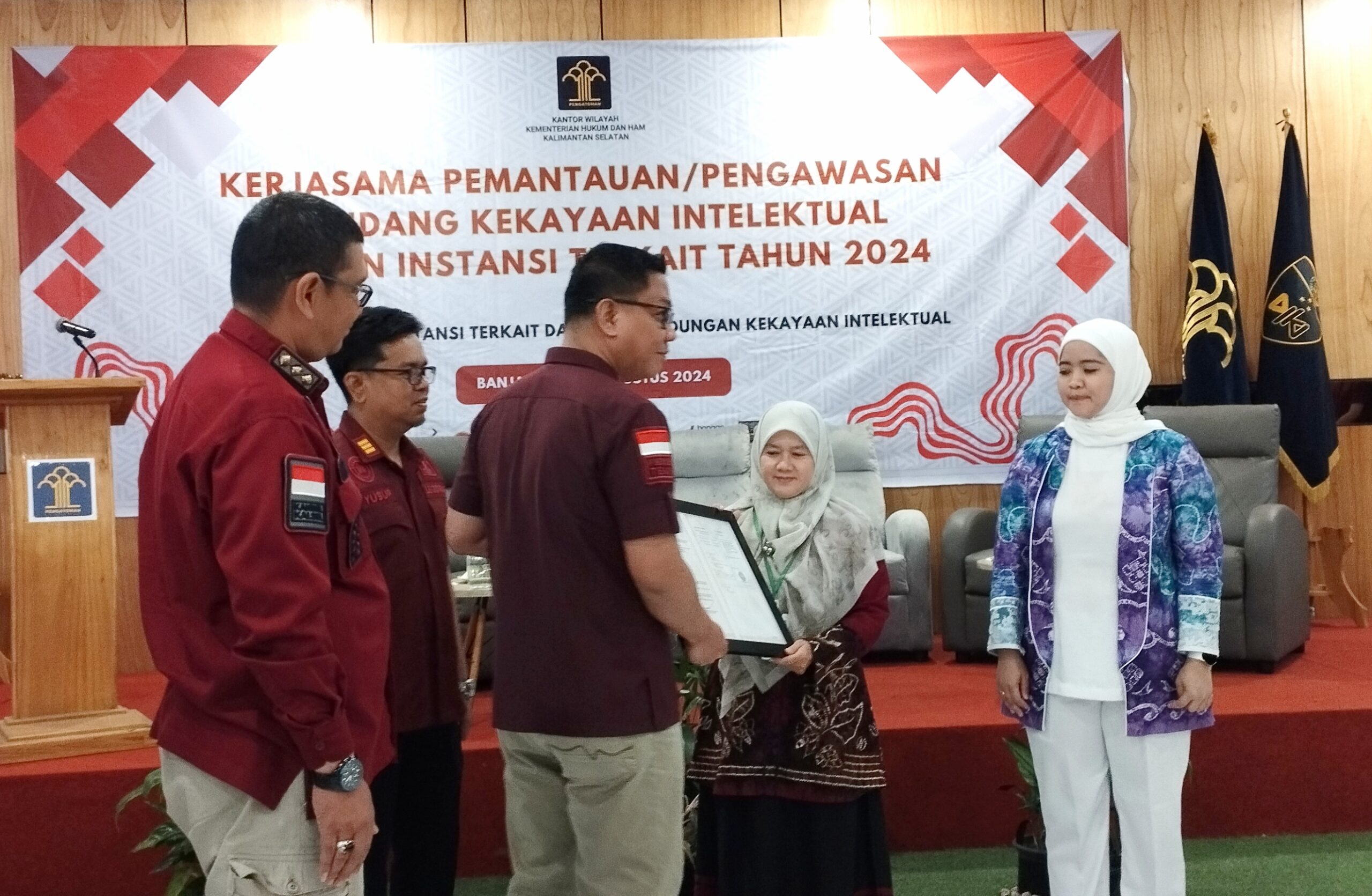Hal itu disampaikan M. Muttaqin dari Dinas Perindustrian Kalimantan Selatan yang menjadi narasumber di acara Kerjasama Pemantauan/ Pengawasan Di Bidang Kekayaan Intelektual Dengan Instansi Terkait Tahun 2024, di Ruang Cempaka Hall Fave Hotel, Banjarbaru, Kamis (15/8/2024).