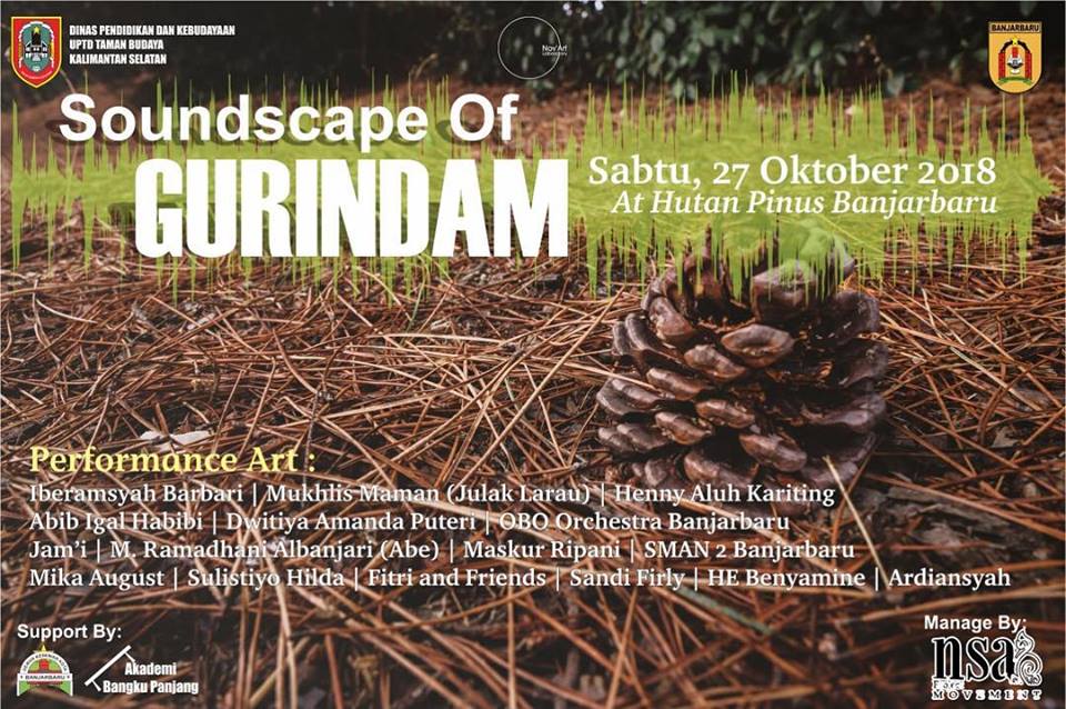 “Soundscape of Gurindam” itulah nama pertunjukannya, yang mungkin sulit dibayangkan, dan tak pernah dialami sebelumnya. Adalah NSA Project Movement, pelaksana acara yang rencananya digelar pada 27 Oktober 2018 di Hutan Pinus, Banjarbaru, pukul 14.00 – 16.30 Wita. Kegiatan ini digelar oleh Taman Budaya Kalimantan Selatan Bekerjasama dengan Pemerintah Kota Banjarbaru melalui Nov’art Laboratory.