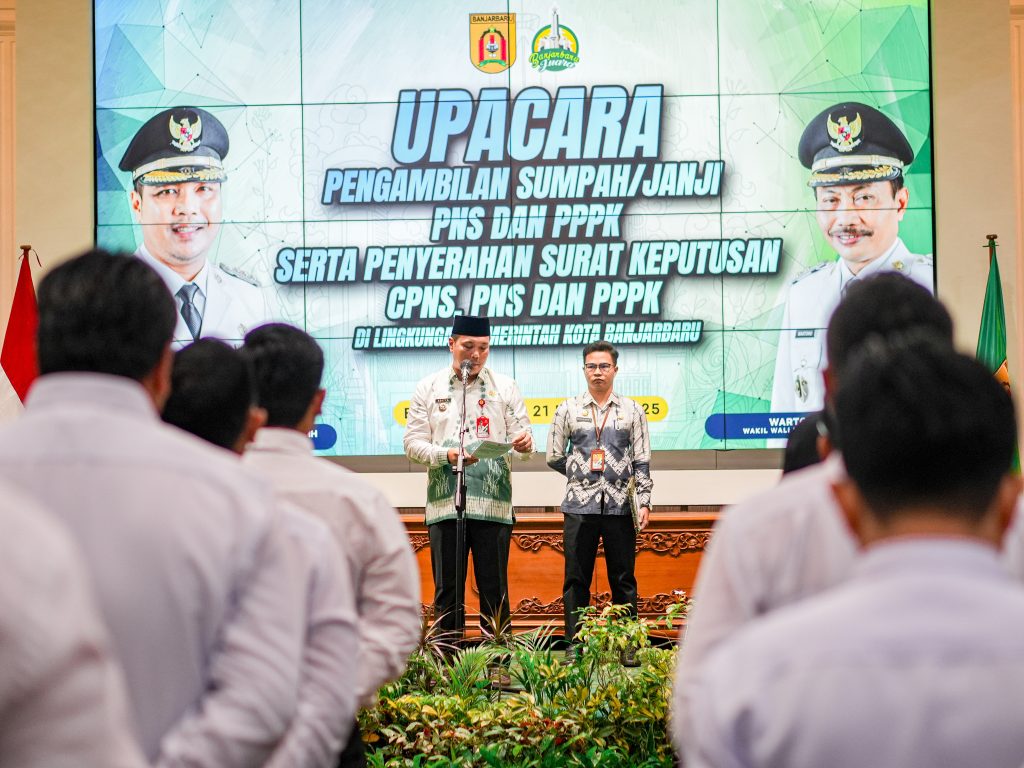 DISAKSIKAN Wali Kota Banjarbaru, H. M. Aditya, Pengambilan Sumpah/Janji PNS dan PPPK serta Penyerahan Surat Keputusan (SK) CPNS, PNS, dan PPPK di lingkungan Pemerintah Kota Banjarbaru digelar di Aula Gawi Sabarataan pada Kamis (6/3/2025).