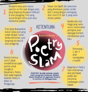 Seperti pada Jumat (24/10/2025) malam, Poetry Slam hadir di dalam acara Poetry in Action at Mingguraya yang mengusung tema Tanah Air Sumpah Pemuda. Poetri in Action sendiri merupakan kegiatan rutin yang diselenggarakan Akademi Bangku Panjang Banjarbaru yang berlangsung setiap akhir bulan pada malam Sabtu.