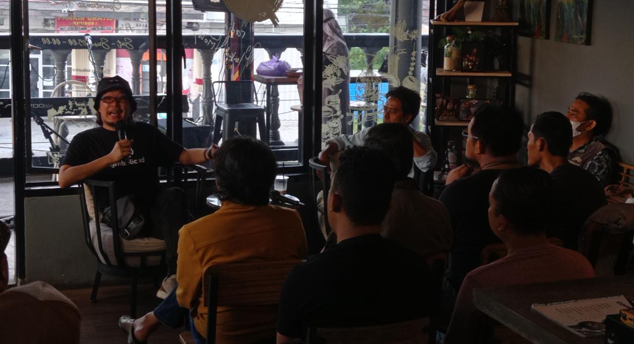 SEBELUM konser mini dilangsungkan, vokalis Letto, Sabrang Mowo Damar Panuluh atau biasa dikenal juga dengan nama Noe Letto berdiskusi dengan sejumlah pegiat literasi di Pahlawan Kopi, Kampung Melayu, Kota Banjarmasin, Sabtu (17/9/2022).