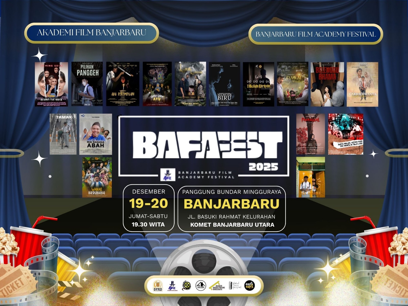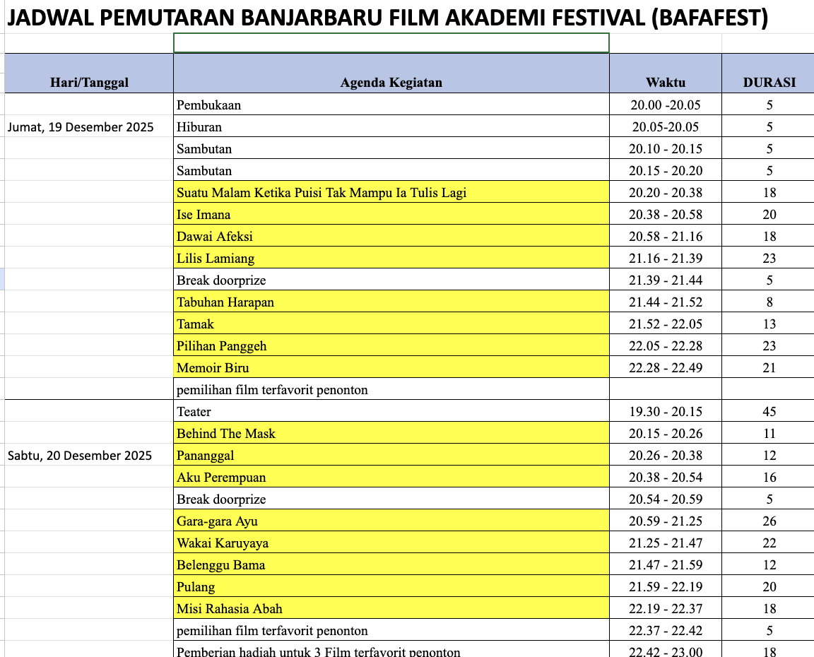 BANJARBARU FILM ACADEMY FESTIVAL (BAFAFEST) akan digeber pada 19-20 Desember 2025 setiap pukul 19.30 Wita-selesai di Panggung Bundar Mingguraya Banjarbaru. BAFAFEST hadir sebagai napas untuk atmosfer perfestivalan film di Banjarbaru dan Kalimantan Selatan secara luas. Kegiatan ini berkolaborator bersama komunitas seradar di bidang perfilman dan kefestivalan, seperti; Wabul Sawi Festival dan Akademi Bangku Panjang Mingguraya.